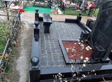 Завершающим этапом стала сборка оградки и укладка брусчатки. Ограждение мы создали из находившихся на могиле секций, кое где закрепив отломавшиеся навершия на разделительные столбики. Перед памятником мы установили гранитный цветник и две траурные урны, а по правую сторону от входа поставили заказанную клиентом лавочку, тоже изготовленную из чёрного гранита. Брусчатку мы замыли водой, одновременно удаляя всю строительную пыль, образовавшуюся в процессе работы.